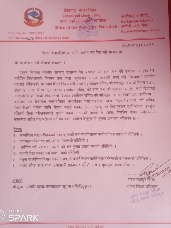 लेखापरीक्षणका लागी आशय पत्र पेश गर्ने सम्बन्धमा।