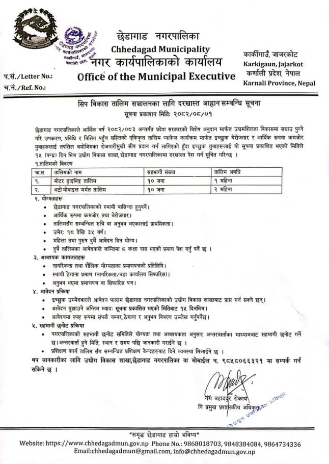 सिप विकास तालिम संचालनका लागी दरखास्त आह्वान सम्बन्धि सूचना।