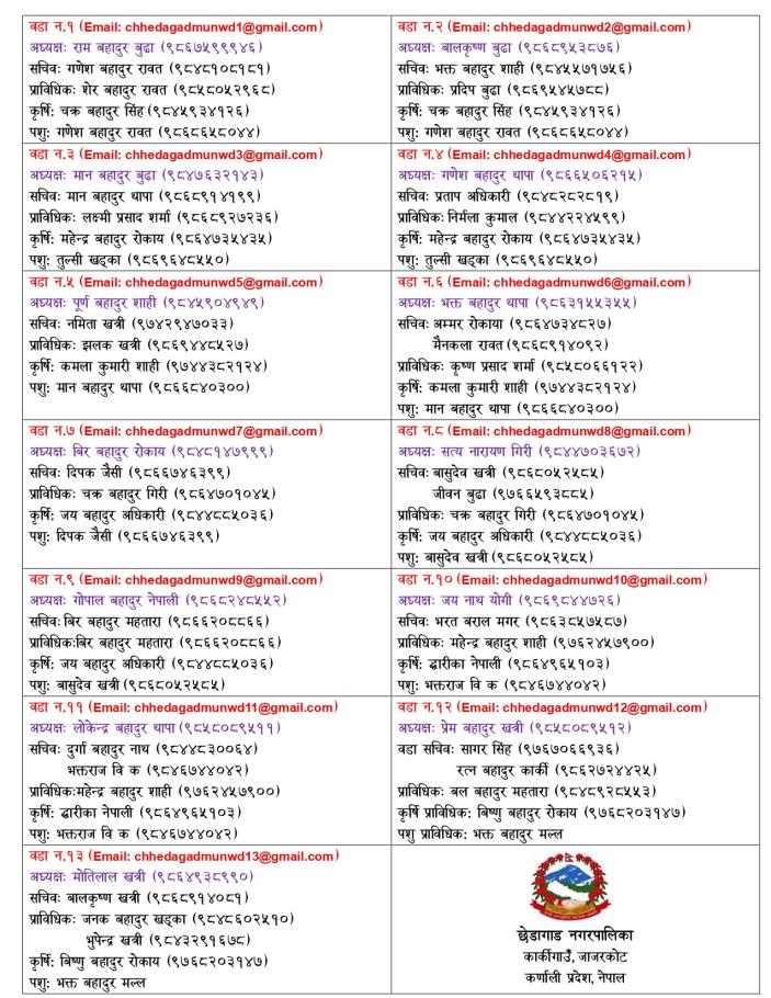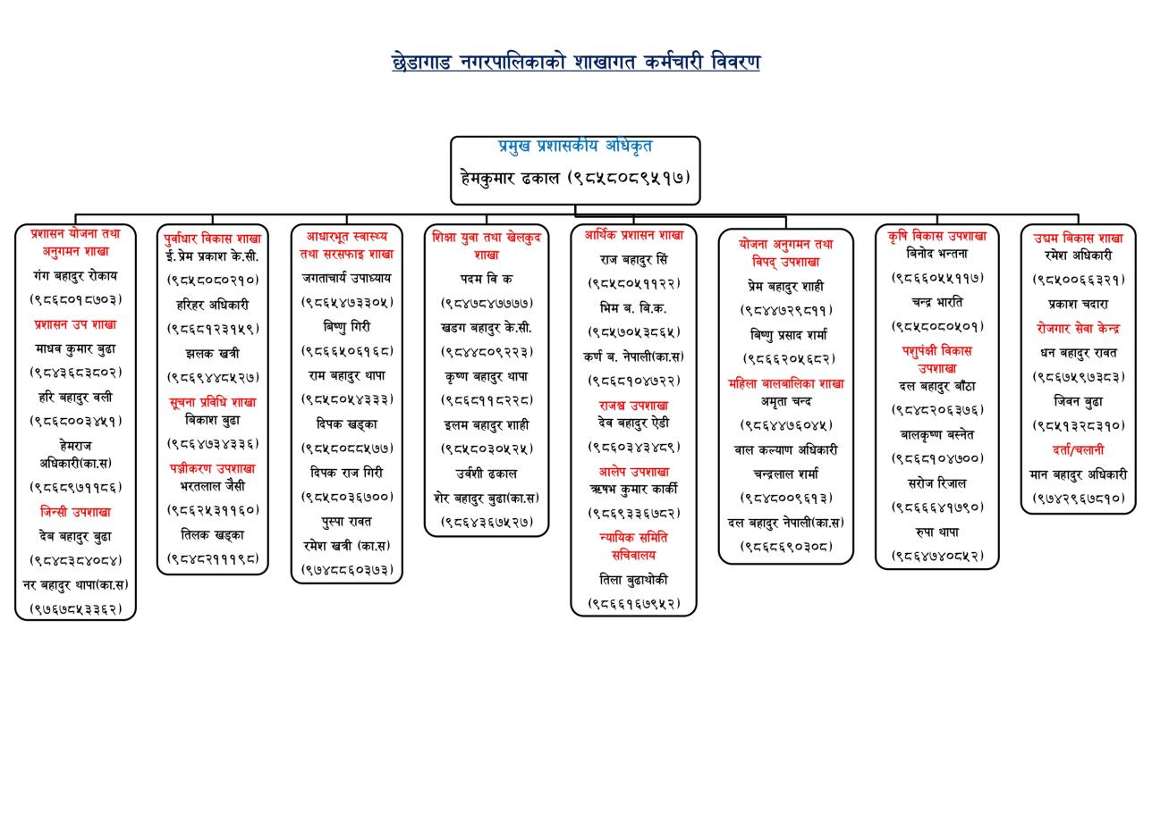 » छेडागाड नगरपालिकाको शाखागत कर्मचारी र वडा कार्यालय सम्पर्क विवरण।