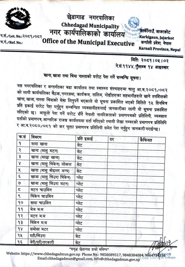 खाजा खाना र पानी आपूर्ति गर्ने सम्बन्धि सिलबन्धि दरभाउ आह्वानको सूचना।