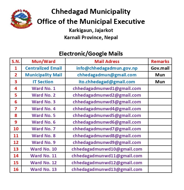 नगरपालिका र वडा कार्यालय ईमेलहरु।