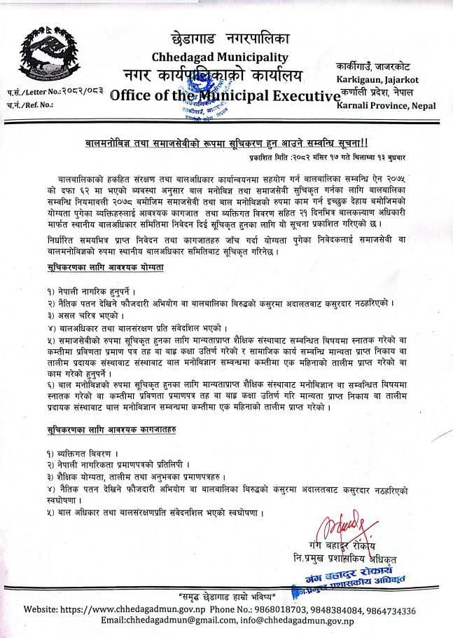 » बालमनोबिज्ञ तथा समाजसेवीको रूपमा सूचीकरण हुन आउने सम्बन्धि सूचना।