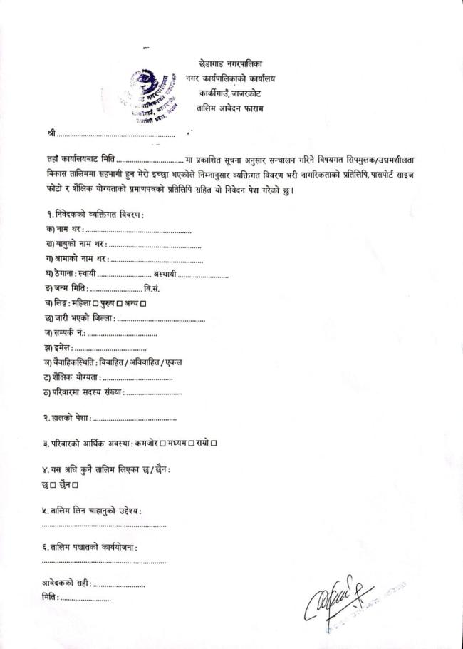 सिप विकास तालिम संचालनका लागी दरखास्त आह्वान सम्बन्धि सूचना।